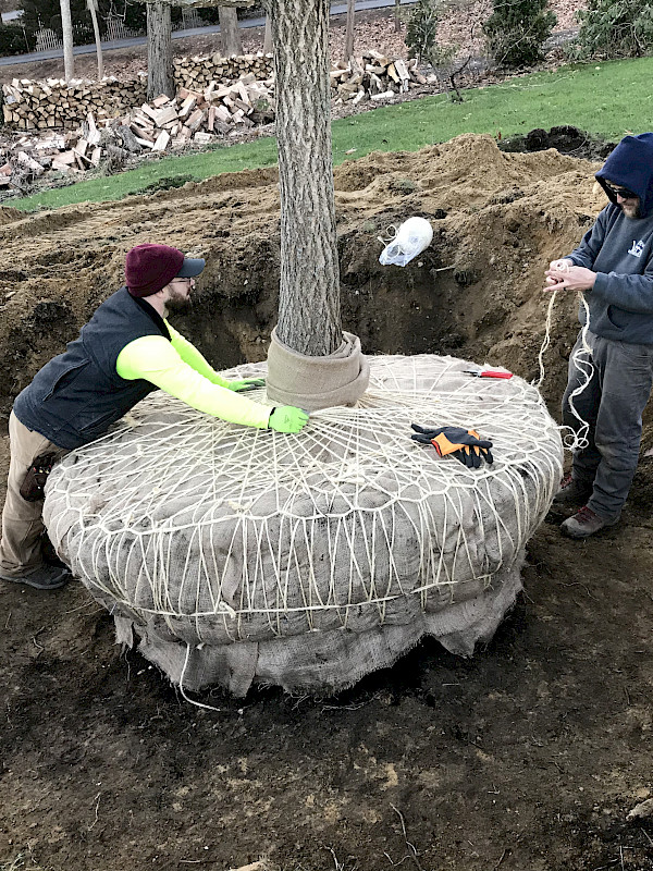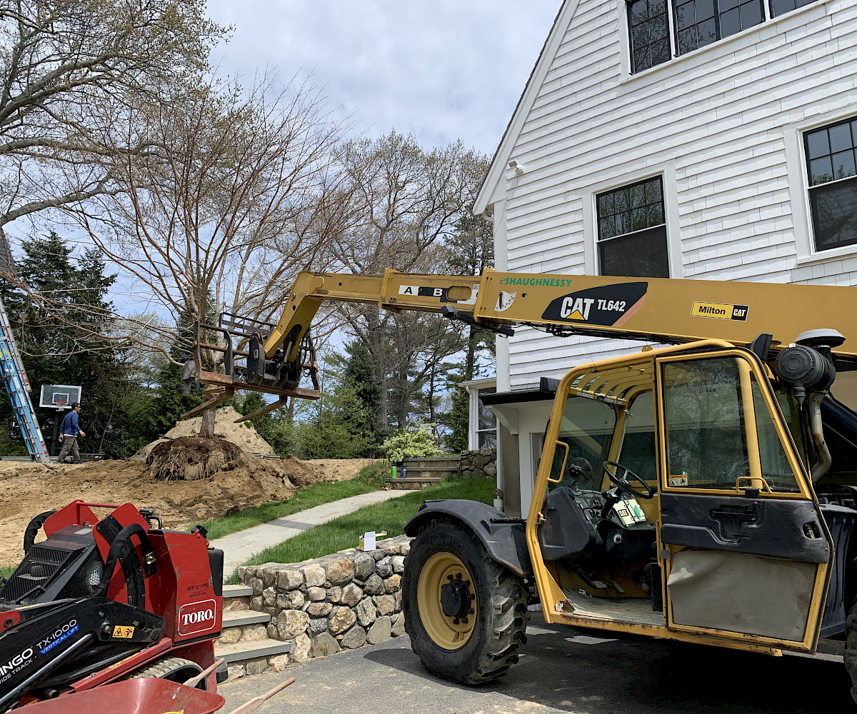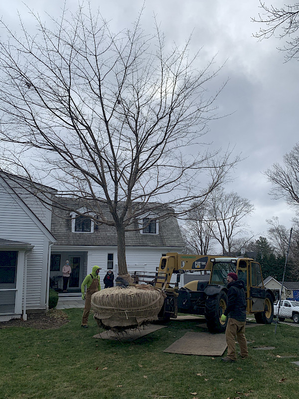 Specimen Fringe Tree (Chionanthus virginicus) was relocated and heeled in above ground with organic mulch to accomade a new barn structure. Tree was reinstalled the following Spring adjacent to the new building, adding a beautful sense of scale