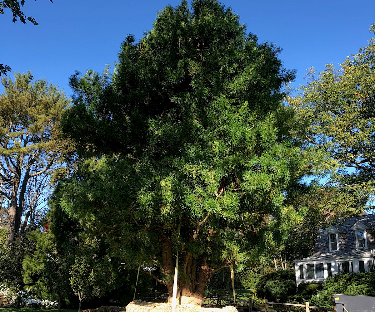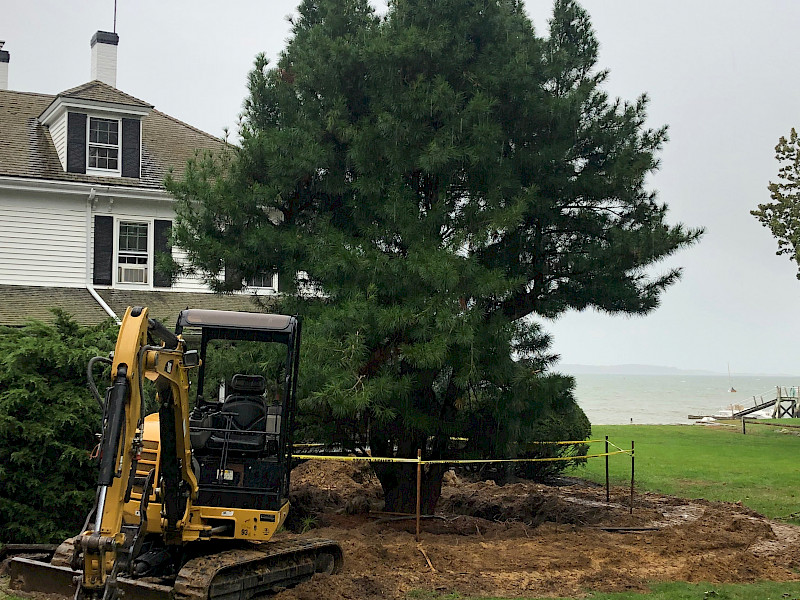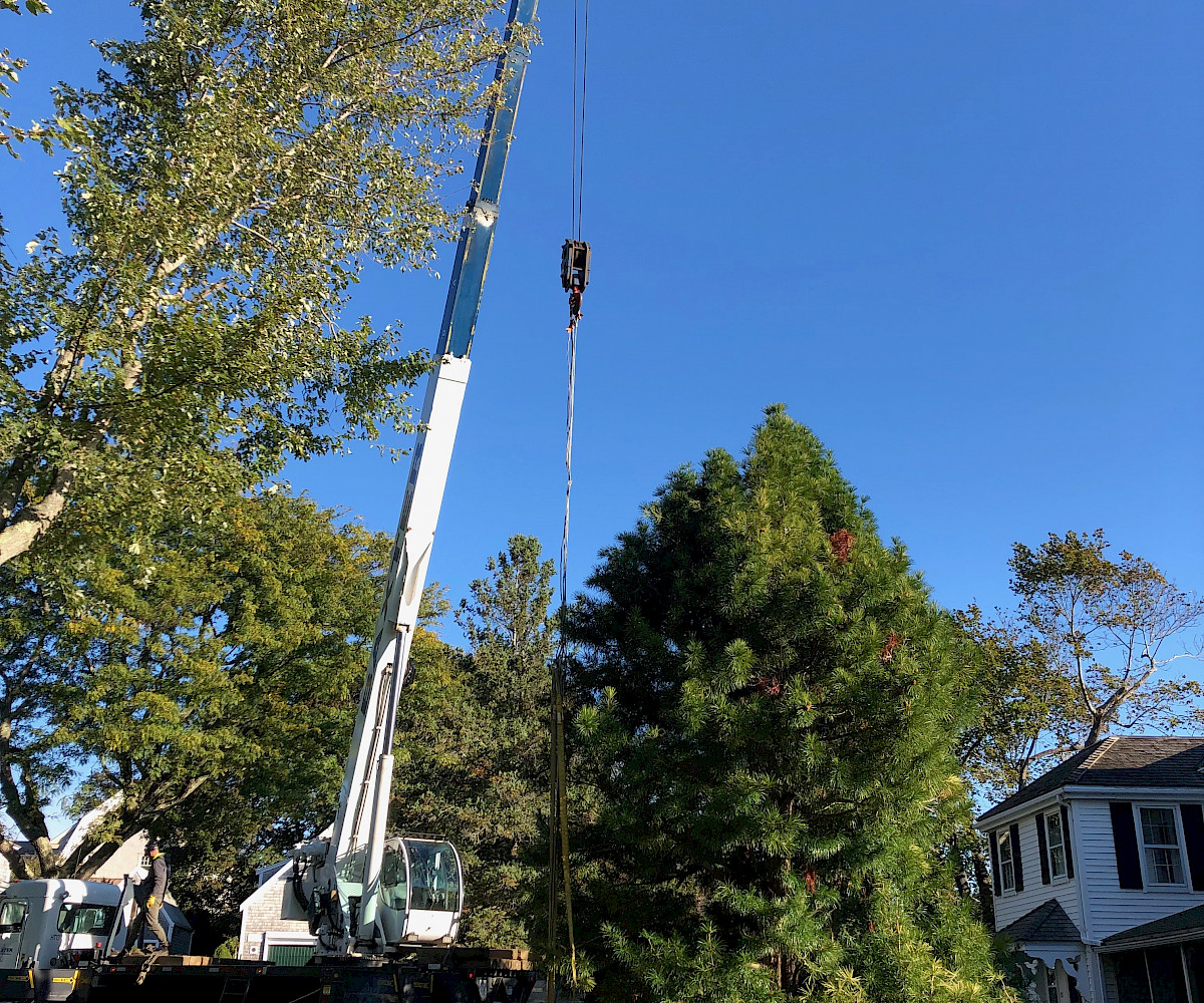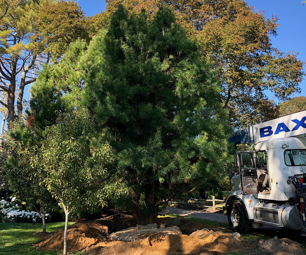 A Mature Umbrella Pine with a long history to the property was carefully hand dug and moved with a crane. The Approximate tree weight during the crane lift was 11,000 pounds.