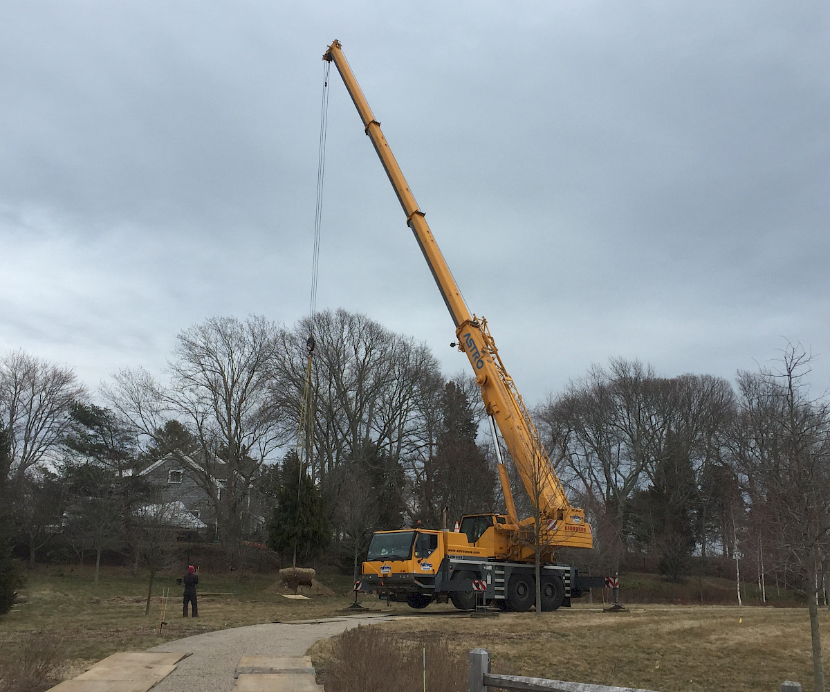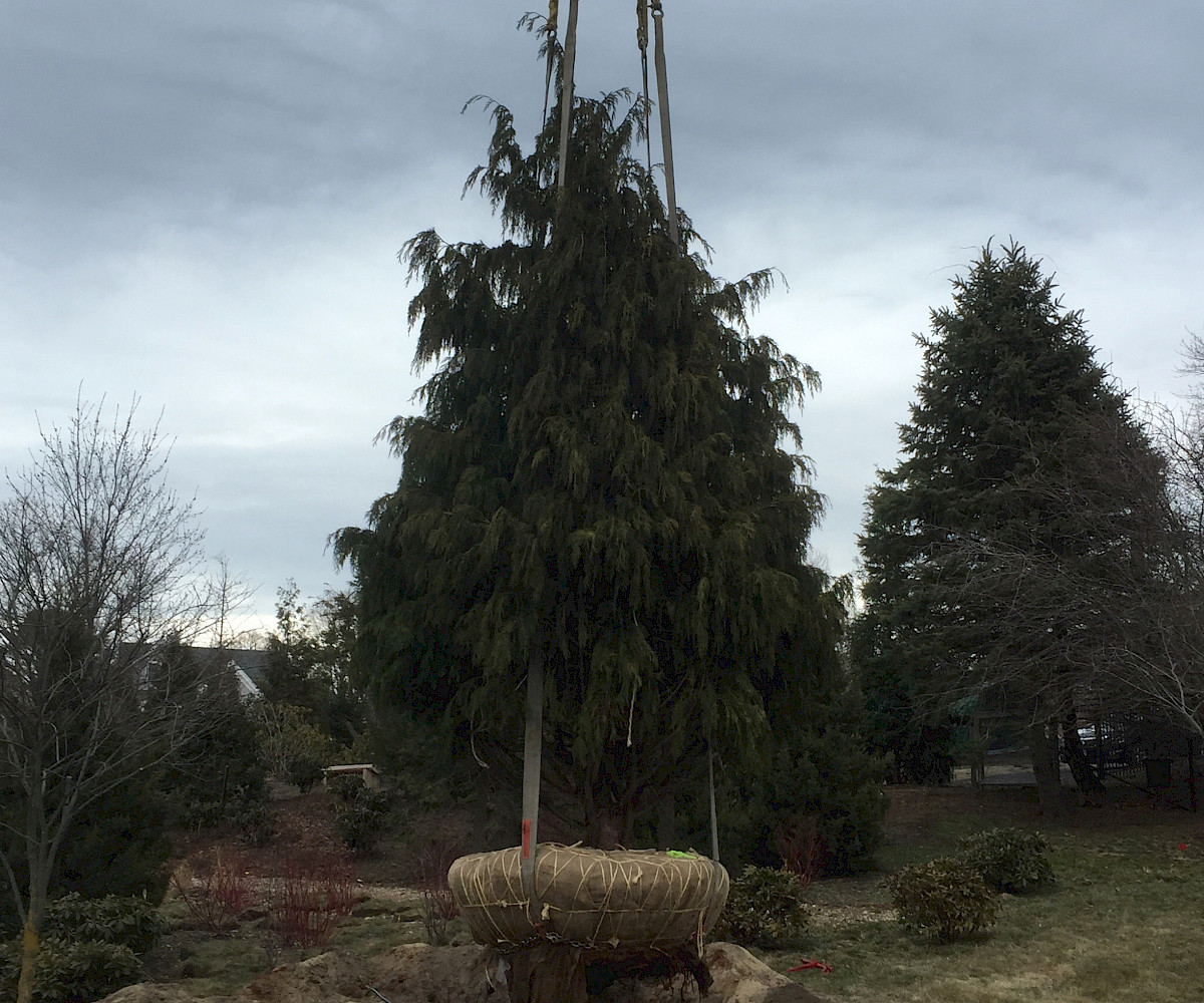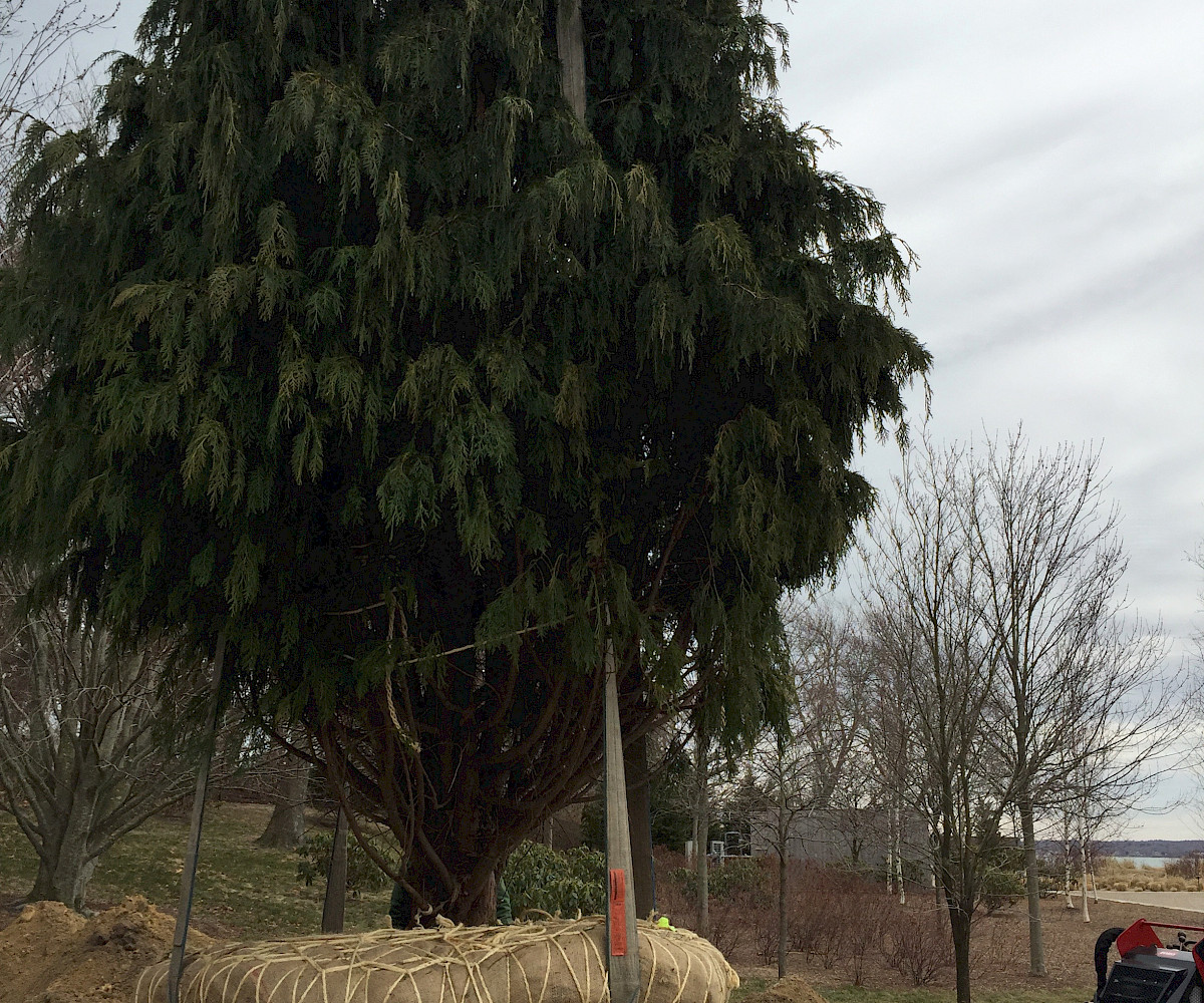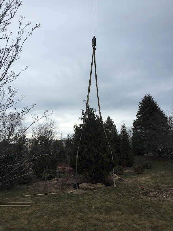 Transplanting of two Weeping Alaskan Cedars (Chamaecyparis nootkatensis) with a crane in early Spring.