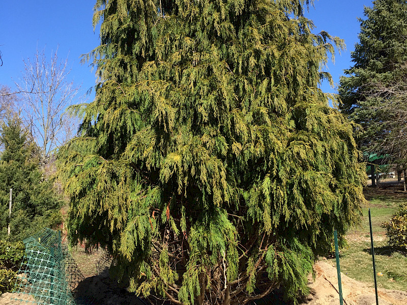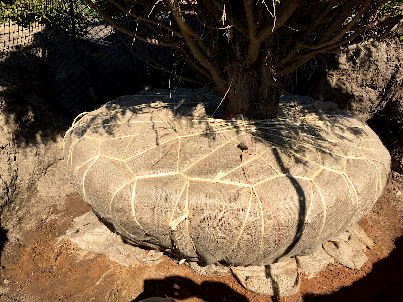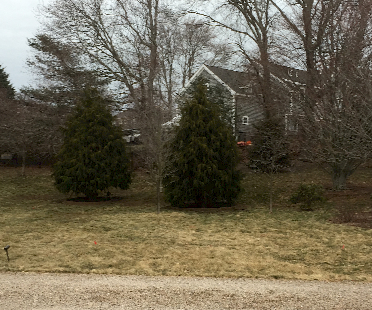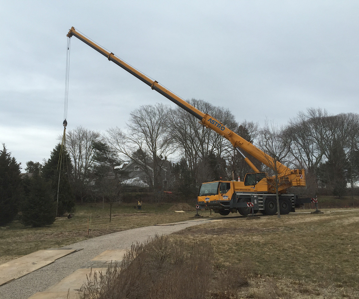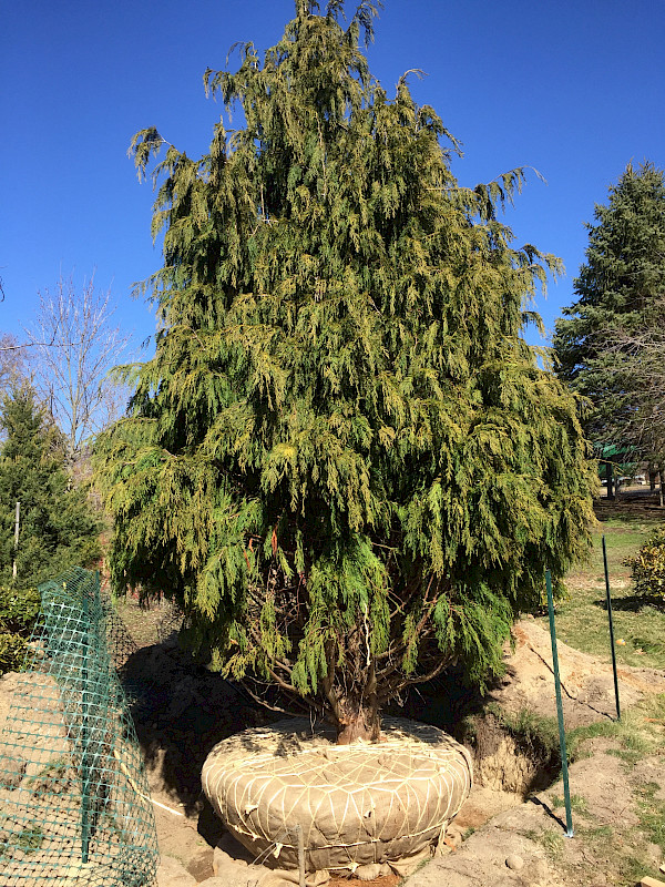 Transplanting of two Weeping Alaskan Cedars (Chamaecyparis nootkatensis) with a crane in early Spring.